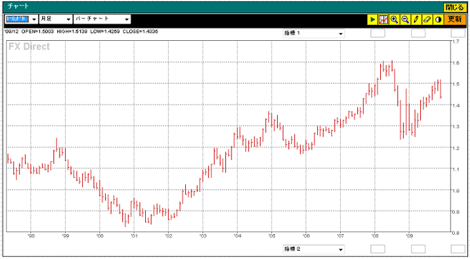 ユーロドルの為替レートは今後の米国とユーロ圏の景気、国力に対する世界中の投資家の期待感を見ることができる通貨ペアです。ユーロ経済が強くなると皆が考えれば、ユーロ買いドル売り、逆に米国経済が強くなると考えればユーロ売りドル買いになります。 現在のところ、米国経済に復活の兆しは見えてきていない一方、ユーロ圏は失業率などの雇用、消費者物価指数など物価関連の経済指標がいまだ回復していないものの、鉱工業生産指数など景気回復の兆しとなる重要指標は好転してきているため、米国にかわりユーロが世界経済回復のけん引役となることが予想されます。2010年前半はユーロドルは上昇、後半は米国経済回復の兆しが見え、下落というトレンドが発生することが予想されます。