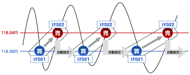 リピートイフダン注文とは、予め指定したレートで売り買いを繰り返す自動複合型注文です。以下の図では118.00円で買い、118.64円で売るという注文を繰り返し発注します。これはIfDone注文なので新規・決済注文を同時に発注できるという非常に便利な注文方法です。