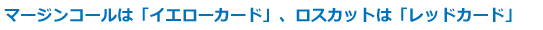 サッカーで喩えるなら、「マージンコール」が「イエローカード」、「ロスカット」が「レッドカード」です。 つまり、預けた証拠金の例えば50%分個人投資家が外国為替取引によって損失を抱えてしまったら、外国為替証拠金取引会社はその投資家に「マージンコール」という警告の通達を個人投資家にして、取引を継続したいなら追加で証拠金を預けて下さいと伝えます。一方、「ロスカット」は一発退場です。つまり、預けた証拠金の例えば80%分個人投資家が外国為替取引によって損失を抱えてしまったら、外国為替証拠金取引会社はその投資家の取引を強制的に終了させて、それ以上損失が拡大するのを防いで担保を押さえるのです。
